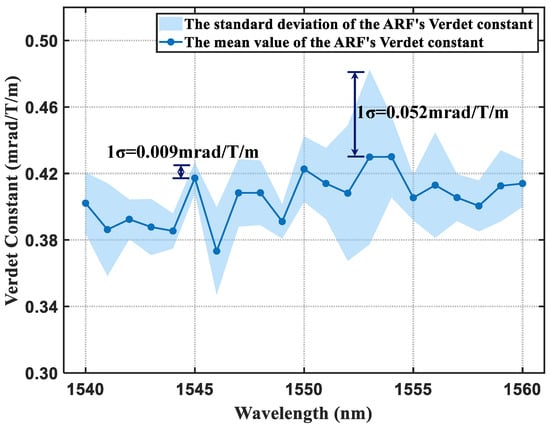 We also measured the effective Verdet constant of ARF in the 1540–1560 nm range, as shown in Figure 6. We set the bandwidth of the tunable filter to 1 nm and the power amplifier drive current to 1.70 A, continuously measuring at 1 nm intervals in the 1540–1560 nm range by changing the center wavelength of the tunable filter. The minimum value of the effective Verdet constant is 0.373 ± 0.026 mrad/T/m at 1546 nm, and the maximum value is 0.430 ± 0.024 mrad/T/m at 1554 nm. The best measurement repeatability of the Verdet constant is 0.009 mrad/T/m at 1545 nm, and the worst is 0.052 mrad/T/m at 1553 nm. The measurement repeatability variation of Verdet constants at different wavelengths results from weak fluctuation in the initial polarization balance state.