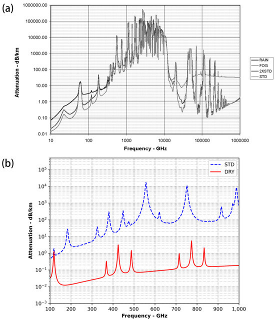 (a) Atmospheric attenuation across the electromagnetic spectrum at sea level based on currently accepted models. Atmospheric pressure P is 1013.25 hPa. Rain = 4 mm/h, fog = 100 m visibility, STD (standard atmosphere) = 7.5 g/m3 water vapor, and 2XSTD = 15 g/m3 water vapor (excerpted from Rosker M. L. et al. [58]). (b) Atmospheric attenuation in the frequency range of 100 GHz to 1 THz (drawn according to ITU-R P.676-12 [59,60])). STD means standard atmosphere with 7.5 g/m3 water vapor, 15 °C temperature (288 K), and 1013.25 hPa atmospheric pressure. DRY means dry atmosphere.