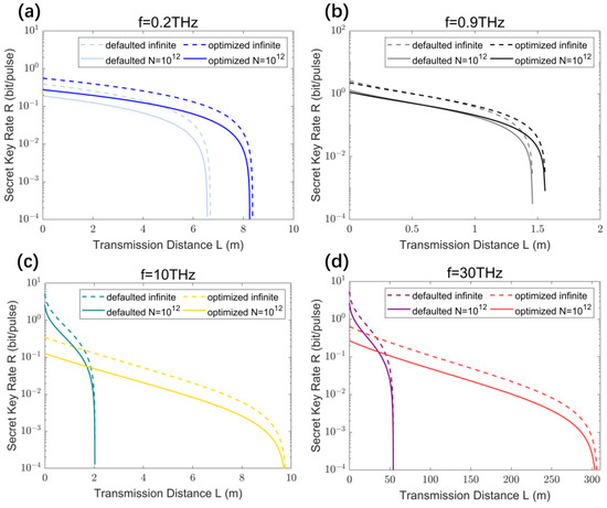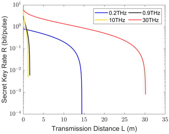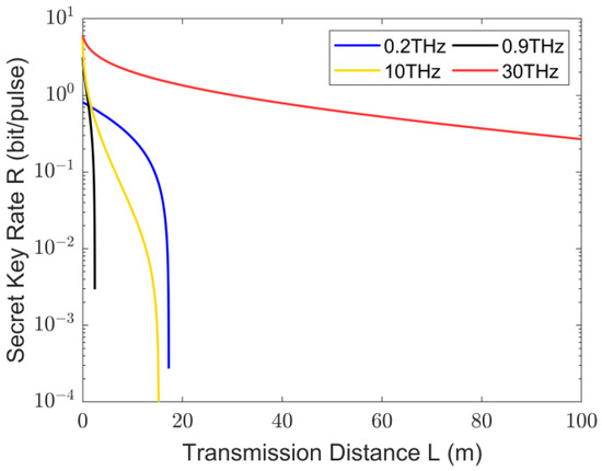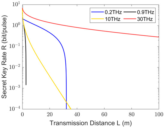 The important parameters for them are the same: ; the reconciliation efficiency ; the modulation variance ; and frequencies of 0.2 THz, 0.9 THz, 10 THz, and 30 THz.