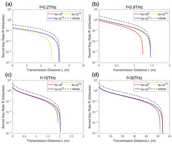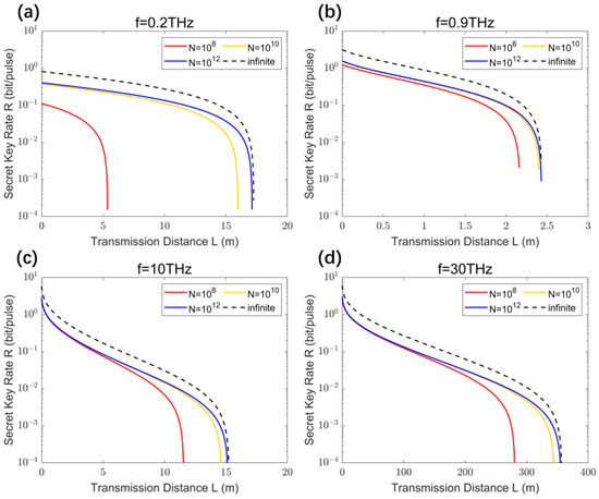 The relationship between the key rate and distance of THz CV-MDI-QKD under the finite-size effect calculated according to Equation (23) is shown in Figure 7. For the convenience of comparison, we set the important parameters in Figure 7 to be consistent with Figure 5, namely (Charlie’s measuring equipment is placed at Bob’s end), modulation variance , and coordination efficiency . We investigated the relationship between the CV-MDI-QKD key rate and transmission distance under four different THz frequencies (values of 0.2 THz, 0.9 THz, 10 THz, and 30 THz, respectively) at different data lengths.