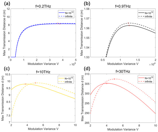 However, when the reconciliation efficiency is less than 1, larger modulation variances do not necessarily yield better results. Referring to Equation (23), we studied the impact of different modulation variance values on the farthest secure transmission distance under the conditions of and approaching infinity, with and modulation variance values . As shown in Figure 9, each subgraph displays the farthest transmission distances changes with different modulation variances for different THz frequencies, with the red circles indicating the extremum points of the respective curves. The farthest transmission distance refers to the distance at which the protocol’s key rate becomes zero, signifying that beyond this distance, the THz CV-MDI-QKD protocol will be unable to generate a secure key.