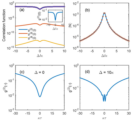 (a) Zero-time delay correlation functions and (b) average photon number as a function of the resonator detuning . The other parameters are taken as , and . The solid lines represent the numerical results, and the symbols “o” denote the analytical results [based on Equations (8) and (9)]. The inset is the zero-time-delay second-order correlation function . The time-dependent second correlation function with the resonator detunings (c) and (d) .