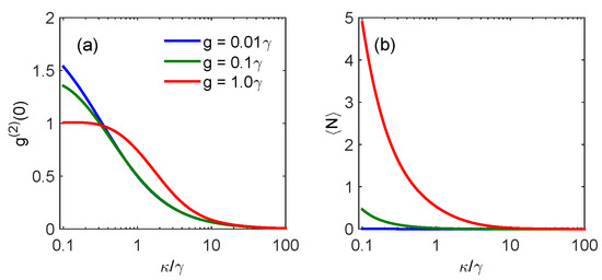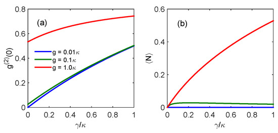 (a) Zero-time delay second-order correlation function and (b) average photon number as a function of the cavity decay rate at different coupling strengths , and . The other parameters are and .
