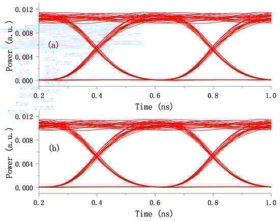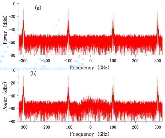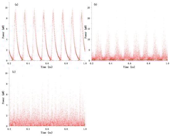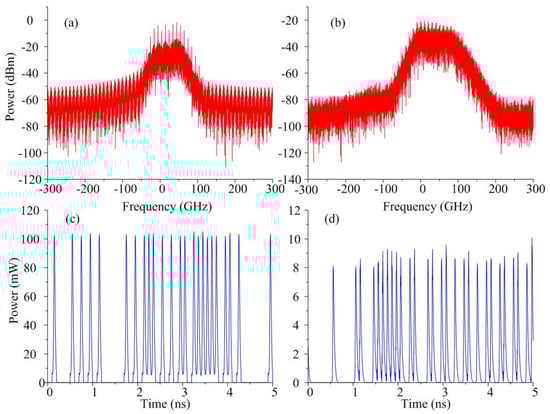For a DFB laser gain-switched by a 10 GHz electrical signal, the waveform and spectrum are shown in Figure 2a and Figure 2c, respectively. is 0.2 A and is 0.2 A. The spectra of the gain-switched optical pulses are optical frequency combs. For a DFB laser gain-switched by a 2.5 GHz electrical signal, the waveform and spectrum of the optical time-division multiplexed signal are shown in Figure 2b,d. is 0.08 A and is 0.2 A. The optical time-division multiplexed signals have the same bit rate as 10 Gbps optical pulses, and the spectrum is continuum and wideband.