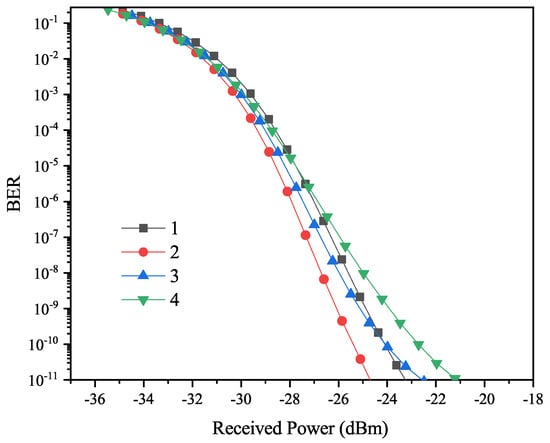 The BER curves versus the different received powers of the public channels are shown in Figure 5. As can be seen, the public channels have different receiver sensitivities. When comparing the BER curves with the ASE noise and with the covert signal, the power penalty is smaller than 0.3 dB. Therefore, the optical time-division multiplexed covert signals have a minimal impact on the public channel.