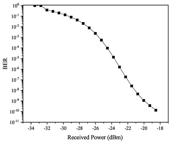 After being optical time-division multiplexed, the covert signal was modulated by a 10 Gbps signal for a single user. The BER curve of the 10 Gbps optical covert signal is shown in Figure 9. The optical covert channel can be transmitted error-free. In addition, the receiver sensitivity of the single-user covert channel is larger than that of the multiple-user covert channel.