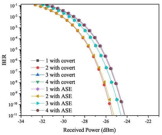 The BER curves versus the different received powers of the public channels are shown in Figure 10. Compared with Figure 5, the public channels have similar receiver sensitivities. Furthermore, when comparing the BER curves with the ASE and with the covert signal, it is observed that there is a minor power penalty for the public channel when a single-user optical covert channel is present. Hence, the architecture employed for optical time-division multiplexing has a negligible effect on the performance of the public channel.