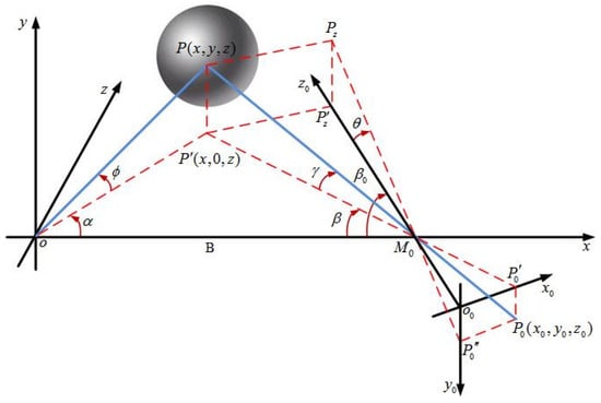 According to Figure 1 and based on the triangulation method and the pinhole model, the analytical imaging model of the SLDI is derived as follows: