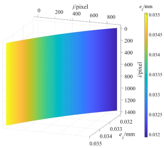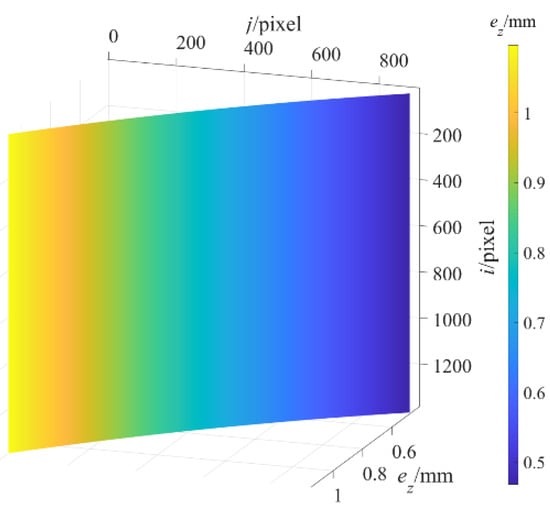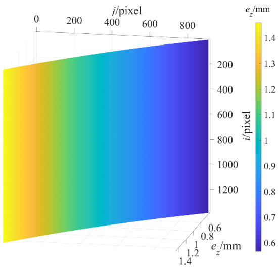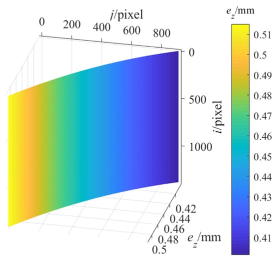 Continued data processing for to verify the performance our proposed method. The experimental data processing of followed exactly the same experimental data processing of . The depth measurement error image of the standard plane at the maximum measured depth of 1365.0000 mm after structural parameter correction was obtained as shown in Figure 7, and further, of the average value of the depth measurement error after structural parameter correction are displayed as the black curve in Figure 8, and then the maximum value of is 0.0432 mm. Therefore, the depth measurement error is mm after structural parameter correction. In contrast, the depth measurement error after structural parameter correction is reduced to 3% of that before structural parameter correction. The results show that the proposed method significantly reduces the DMECSPE.