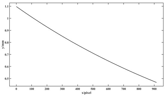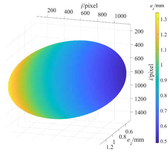- Performed Step 8. The depth measurement error image of the standard plane at the maximum measured depth of 1365.0000 mm before structural parameter correction is obtained as shown in Figure 5, and further at are displayed as the black curve in Figure 6, where y and x represent and , respectively, and then the maximum value of is 1.4586 mm. Therefore, the depth measurement error mm before structural parameter correction.