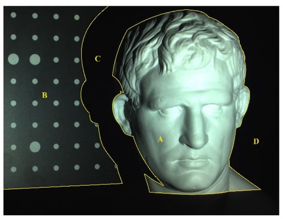 We measured a more complex scene to visually demonstrate the success of our proposed method. Figure 17 shows the scene photograph, and the scene includes Statue A of Agrippa with complex morphology, Steel-plate B with bright feature points on dark surface, Shadow C, and Background D, and Figure 18 shows the 3D reconstructed result of the scene. This experiment demonstrated that the proposed method can reconstruct complex 3D surfaces with fine details, isolated surfaces, and surfaces with a sharp contrast between light and dark. It is important to point out that the experimental result is only a qualitative result, as shown in Figure 18, and a good depth imaging effect could be obtained by the method. The work does not provide the comparative analysis of the DMECSPE before and after correction. This is because in the actual measurement experiments, the depth measurement error of the SLDI includes the depth measurement error caused by both the phase measurement error and the structure parameter error. The depth measurement error caused by the latter is difficult to clearly observe because it is submerged by that caused by the former, and the former is complex and difficult to control in the actual measurement experiments. In addition, the depth measurement errors caused by the latter were only analyzed and corrected in this work, so it is difficult to quantitatively express the comparison of depth measurement errors before and after structural parameter correction.