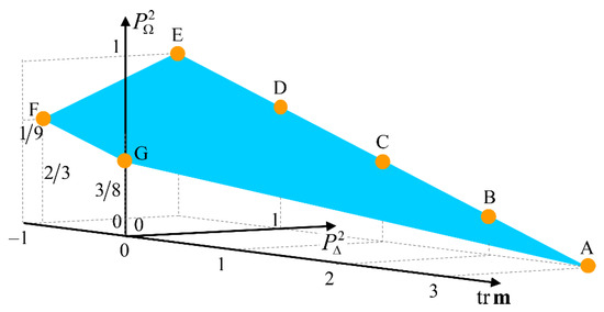 The feasible region for sets of values is shown in Figure 1. Achievable values are limited by the polygon with vertices AEFG. Edge AE corresponds uniquely to nondepolarizing Mueller matrices, with point A being genuine of , while as seen above, point E is reached exclusively by half-wave retarders. All physical situations for depolarizing Mueller matrices (i.e., ) have associated points in the polygon AEFGA, excluding edge AE. The values of the quantities for each of the points indicated in the figure are the following: , , , , , and .