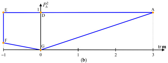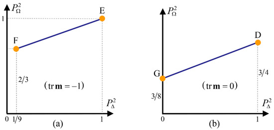 Projection of the feasible region on the plane (a), and projection of the feasible region on the plane (b). Edge AE corresponds to nondepolarizing Mueller matrices , which exhibit maximal polarizing power for each given value of ; edge EF corresponds to Mueller matrices satisfying ; edge FG corresponds to isotropic intrinsic depolarizers of the form , with , which exhibit minimal polarizing power and minimal degree of polarimetric purity for each given negative value of ; and edge GA corresponds to Mueller matrices of intrinsic depolarizers of the form , with , which exhibit minimal polarizing power and minimal degree of polarimetric purity for each given positive value of .