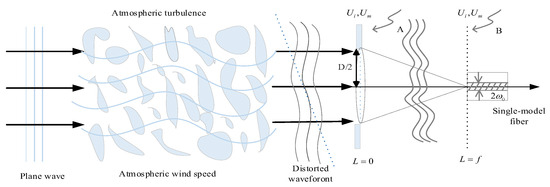 where |r| ≤ D/2 is a point located on the pupil plane within the aperture, D indicates the receiving lens’s diameter, Pc represents the mode coupling coefficient, Pa represents the total optical power entering the receiving aperture, denotes the incident optical field transmitted at the aperture, [2] is the optical field in the absence of turbulence [8,9,10], is the amplitude fluctuations of the optical wave field, S(r) describes the complex phase perturbation induced by atmospheric turbulence, [2] is the aperture transmittance function, [1] is the back-propagated fiber mode profile in the receiver aperture plane (A), and the asterisk indicates the complex conjugate. The mode coupling coefficient (Pc) can be written as follows [1,24]: