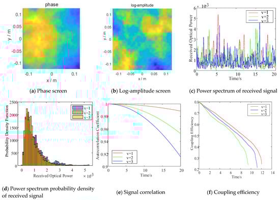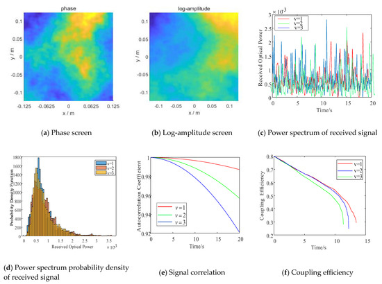 Analysis of optical signal’s transmission performance when the mean-square value of the transverse wind speed (w) = 30 m/s, the atmospheric coherence length (r0) = 0.46 m, and the transverse wind speed (v) = 1 m/s, v = 2 m/s, and v = 3 m/s. (a) Phase screen, (b) logarithmic amplitude screen, (c) change in the power spectrum of the optical signal, (d) change in the probability density of the power spectrum of the optical signal, (e) change in the correlation of the optical signal, and (f) change in the coupling rate.
