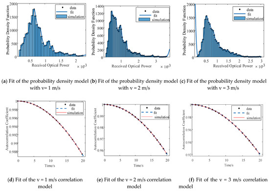 Figure 2 shows an analysis of the optical signal’s transmission performance when the mean-square value of the transverse wind speed (w) = 21 m/s, the atmospheric coherence length (r0) = 0.6035 m, and the transverse wind speed (v) = 1 m/s, v = 2 m/s, and v= 3 m/s. To illustrate the effectiveness of the proposed method, another set of data is used for the Monte Carlo simulation. Figure 3 shows an analysis of the optical signal’s transmission performance when the mean-square value of the transverse wind speed (w) = 30 m/s, the atmospheric coherence length (r0) = 0.46 m, and the transverse wind speed (v) = 1 m/s, v = 2 m/s, and v = 3 m/s. Through Figure 2a–f and Figure 3a–f, it is found that the increase in the wind speed causes the fluctuation acceleration of the optical signal’s power spectrum; it affects the model for the power spectral probability density of the optical signal, resulting in a reduction in the temporal auto correlation coefficient of the optical signal, and it affects the coupling efficiency.