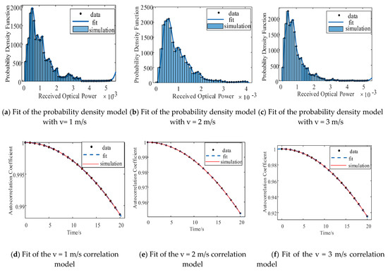 Fits of received optical signal’s power spectrum probability density model and fits of optical signal’s auto correlation coefficient model when transverse wind speed’s mean-square value (w) = 30 m/s, atmospheric coherence length (r0) = 0.46 m, and transverse wind speed (v) = 1 m/s, v = 2 m/s, and v = 3 m/s, respectively.