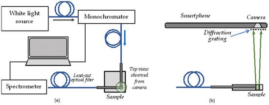 Experimental setup: (a) basic arrangements for the measurement of the 3D excitation–emission spectra of the samples using a standard optical fiber spectrometer; (b) side view of the arrangement from (a) with a smartphone camera equipped with a sheet transmission diffraction grating (1000 L/mm) to observe the spectrum.
