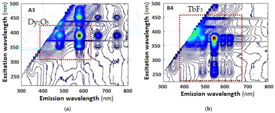 The standard procedure is to scan the excitation wavelength λ’ within a certain range and measure the luminescence spectrum for each excitation wavelength, which allows us plot 3D excitation–emission spectra, the topographic views of which are shown for sample A3 and B4 in Figure 2. It is well known that lanthanide ions have very low absorption coefficients (ε ≤ 1 M−1 cm−1) [15]. To increase light emission, the lanthanide ion can be doped into suitable matrices.