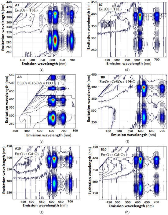 Topographic views of the excitation–emission fluorescence spectra measured by an Ocean Optics spectrometer of synthesized samples from the A (La2O3 + H3BO3) and B (Al2O3 + H3BO3) groups: (a) A3—(Dy2O3); (b) B4—(TbF3); (c) A7 and (d) B7—(Eu2O3 + TbF3); (e) A8 and (f) B8—(Eu2O3 + Ce(SO4)2 × 4 H2O); (g) A10 and (h) B10—(Eu2O3 + Gd2O3). The red rectangles show the wavelength ranges within which the spectra were measured with the smartphone.