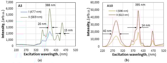 Excitation efficiency spectra and bandwidths of samples: (a) A3 and (b) A10.