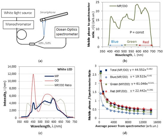 Spectrometer vs. smartphone comparison: (a) an auxiliary experimental setup to compare spectrometer and smartphone responses; (b) the spectral dependence of the ratio r(λ) between the signal from the mobile phone to that of the spectrometer for a given signal level P(λ); (c) a white LED spectrum as measured by a spectrometer (OO) and a smartphone (MP); (d) the r(P) dependence for each of the R, G, and B spectral ranges.
