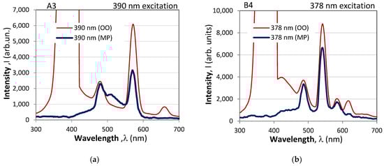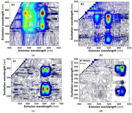 The same observations, to a different degree, are valid for samples B8 and B10 shown in Figure 10 and Figure 11. In all cases, what is important for the purposes of this study is the possibility of clearly outlining and identifying the strong narrow excitation–emission spectra, which proves to be successful.