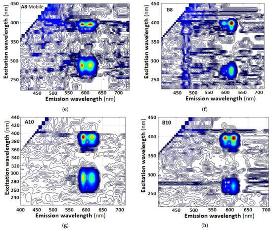 Topographic view of the excitation–emission fluorescence spectra of the two samples in Figure 3, taken by a smartphone: (a) A3; (b) B4; (c) A7; (d) B7; (e) A8; (f) B8; (g) A10 and (h) B10.