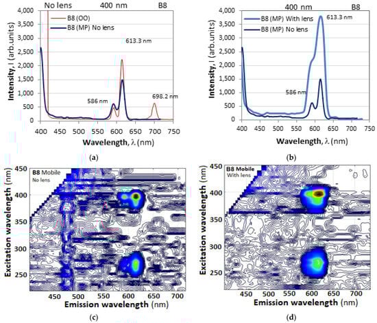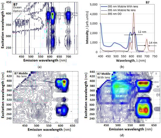 Illustration of spectral resolutions for B8: (a) Ocean Optics spectrometer spectrum vs. mobile phone spectrum without a lens; (b) mobile phone spectra with and without an additional lens; (c) topographic view of the 3D excitation–emission spectra of sample B8 taken by a mobile phone without lens; (d) same as (c) with a lens.