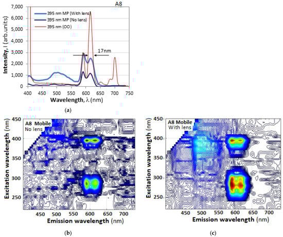 Illustration of the effect of using a magnifying lens for A8: (a) topographic view of the 3D excitation–emission spectra taken by a mobile phone with a lens; (b) comparison between the spectra of A8 excited at 395 nm taken by a spectrometer (OO) and a mobile phone with and without a lens; (c) same as (b) but with lens.