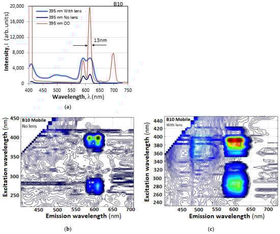 (a) Comparison between the spectra of B10 excited at 395 nm taken by a spectrometer (OO) and by a mobile phone with and without a lens. (b) A topographic view of the 3D excitation–emission spectra taken by a mobile phone without a lens; (c) same as (b) but with a lens.