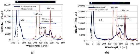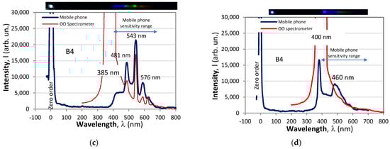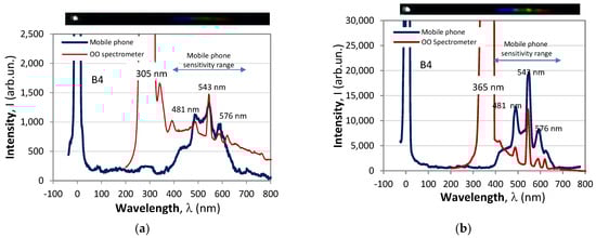 - The smartphone efficiently cuts off the emission from the excitation sources in the UV range, as evidenced by Figure 6a,b, in which range the spectrometer may be saturated.