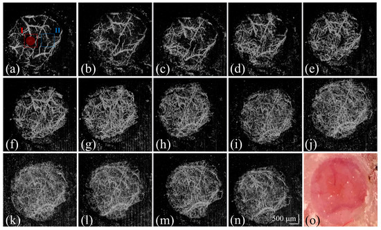 Figure 5a–n shows the corresponding projection-view OCTA results of Figure 3 and Figure 5o, which represent the photo taken on Day 14 after removing the skull. The red circle in Figure 5a that marks the injection region and subsequent images captures the progression and spread of tumor-induced vascular alterations. Initially, the vasculature in the brain tissue is clearly defined, with distinct vascular boundaries that can be easily discerned, as shown in Figure 5a. The injection site is marked, providing a reference for subsequent changes. Over time, as the tumor cells proliferate, they induce the formation of new blood vessels (angiogenesis). This is visible in the changing vascular patterns, where boundaries become less distinct, as shown in Figure 5b–n. Interestingly, some of the main vessels visible on Day 1 seem to disappear or become obscured as the tumor progresses. This could be due to the vessels being compressed or remodeled by the growing tumor, or the formation of a denser network of smaller vessels that are harder to distinguish individually.