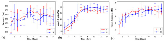 Quantitative analysis of OCTA results of 5 mice including (a) vessel diameter, (b) vessel density, and (c) fractal dimension. The red and blue lines represent the analytic results evaluated from ROI 1 and 2, as indicated by the red and blue squares in Figure 5a.