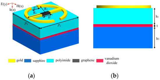 We used the CST Microwave Studio to conduct numerical simulations using a frequency domain solver to investigate the transmission and absorption properties of the structure. The proposed structure diagram is shown in Figure 1. The unit structure period is 240 µm, the outer diameter R1 of the top ring is 100 µm, the inner diameter R2 is 80 µm, and the linear distance g2 between the opening of the upper and lower half rings is 20 µm. The CW structure in the middle of the ring is composed of gold and graphene material; the length of the graphene g1 is 36 µm, and the lengths of the two gold CW are the same. As shown in Figure 1a, the structure has a total of four layers, from top to bottom, which are patterned metal and graphene, polyimide, VO2 film, and sapphire substrate. Among them, the relative dielectric constants of sapphire, polyimide, and VO2 (thickness t is 1.2 µm) are 9.67, 3.1, and 9, respectively, and the polyimide loss tan δ = 0.07. The thickness of the top metal is 0.2 µm, the polyimide thickness h2 is 20 µm, and the sapphire thickness h1 is 50 µm.