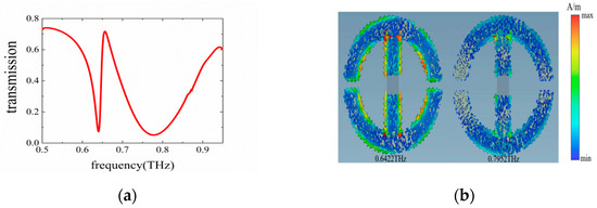 (a) When the VO2 conductivity is 10 S/m, the transmission spectral line of the entire structure. (b) Surface current distribution diagram of metasurface structure.