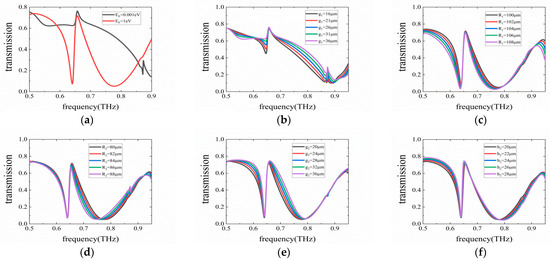 As shown in Figure 3b, when the length of graphene increases, the transmittance increases, the Fano peak gradually disappears, and the adjustment of g1 can also improve the Q value of the structure. As shown in Figure 3c, when the outer diameter of the ring increases, the interaction between the structures is enhanced, the distance between the two resonant peaks gradually increases, and the peak value slowly decreases. At the same time, the increase in the whole structure’s metal area will cause the system’s loss to increase, and the half-height full width will become wider. As shown in Figure 3d, on the contrary, when the inner diameter of the ring increases, the peak value slowly decreases, the distance between the two peaks decreases, and the half-height full width gradually decreases. As shown in Figure 3e, when the ring opening becomes larger, the transmittance increases slowly, and the resonant frequency moves slowly to the high frequency. As shown in Figure 3f, when the thickness of the polyimide increases, the peak value is almost unchanged, and the resonant frequency slowly moves to the high frequency.