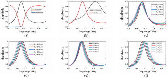 As shown in Figure 4b, when the Fermi level of graphene increases, the resonant frequency becomes smaller, the absorption efficiency is more than 99.5%, and the absorption bandwidth changes from 0.05 THz to 0.02 THz. As shown in Figure 4c, when the thickness of polyimide increases, the resonant frequency moves to the low frequency, and the absorption efficiency of the absorption peak decreases with the increase in h2, so the optimal thickness of polyimide is determined to be 20 µm. At this time, the entire metasurface structure meets the impedance matching condition, and the equivalent refractive index meets the real part of 1 and the imaginary part of 0. As shown in Figure 4d, when the radius of the ring R1 increases, the resonant frequency moves to the low frequency, and the absorption efficiency of the absorption peak decreases with the increase in R1, but the amplitude of each reduction is small, so the radius of the ring is selected to 100 µm for the best absorption effect. As shown in Figure 4e, when the inner diameter R2 of the ring increases, the resonant frequency moves to the low frequency, and the absorption efficiency of the absorption peak decreases with the increase in R2. As shown in Figure 4f, when the ring opening g2 becomes larger, the resonant frequency moves to the high frequency, and the absorption efficiency of the absorption peak decreases with the increase in g2.