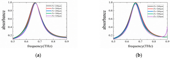 Then, we further study the influence of structural parameters on the absorber, and we discuss the influence of the structure period size on the absorption efficiency. As shown in Figure 5a, when the period length Px increases, the peak value of the absorption peak slowly decreases, and the resonant frequency moves to the high frequency. It can be seen from Figure 5b that when the period length Py increases, the peak value of the absorption peak decreases slowly, and the resonant frequency moves to the low frequency. Through the analysis of simulation experiments, we can think that the absorption efficiency of the structure does not change significantly when the period length is changed, which is a very important phenomenon. Therefore, combined with the above parameter change experiment, we can generate resonance absorption of specific frequencies by adjusting structural parameters. We can also optimize the parameters of the geometry to improve the absorption efficiency. Furthermore, we can also change the scale of the metasurface structure to extend it to other frequency bands.