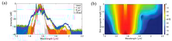 Dependences of SC spectra on (a) input pulse energy (experiment), and (b) waveguide length at a pump energy of 10 pJ (simulation) [16]. Reprinted with permission from [16].