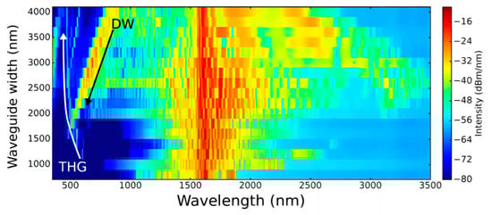 David et al. utilized SiN waveguides with different widths pumped by a 100 MHz repetition rate and 1550 nm fiber laser to generate supercontinuum spectra. The SC spectrum in Figure 2 is shown as a function of the waveguide width. This spectrum spans from approximately 500 nm to over 3 µm, covering a bandwidth of two-octave ranges. The third harmonic generation (THG) and dispersive wave (DW) also appear at the short wavelength region [19].