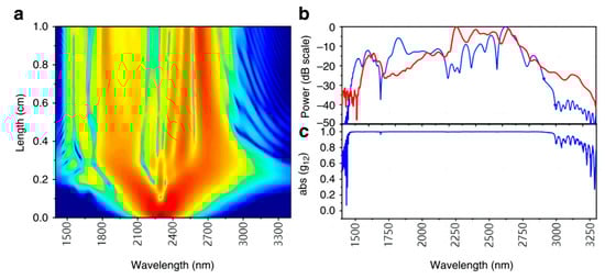 The simulated spectral broadening and coherence of the pulses. (a) Evolution of the spectral content of the optical pulse along the length of the silicon photonic wire waveguide. (b) Simulated spectra after 1 cm of propagation in the waveguide (blue) and the measured supercontinuum (red). (c) Simulated coherence as a function of the wavelength [24]. Reprinted with permission from [24].