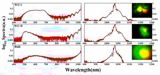 Li et al. inscribed a waveguide from the sapphire crystal using a femtosecond laser [26] and investigated the SC generation from waveguides. Two groups of waveguides with radii of 36 μm and 24 μm (hereafter referred to as WGI and WGII) were fabricated, respectively. The spectral changes in waveguides and bulk sapphire with a length of 5 mm were examined at an input pulse energy of 7.3 μJ. The pump source had a central wavelength of 1030 nm, a pulse duration of 400 fs, and a repetition rate of 300 kHz, respectively. On the short wavelength side, a relatively steady cut-off wavelength of ~450 nm was found, as shown on the left part of Figure 4, but the WG1 waveguide exhibits much better SC spectra in terms of width and flatness. In the right part of Figure 4, the pump lasers have greater expansion up to 1100 nm, while the image in the inset is their respective far-field image from SC emission. This gives clear evidence that the well-structured waveguide is beneficial to the generation of a broad and flattened SC spectrum.
