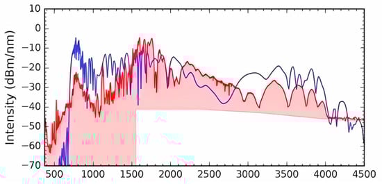 Supercontinuum generation from the lowest-order quasi-transverse-electric (TE00) mode (the red) and the theoretical optical spectrum from the waveguide (the blue). The bottom of the shaded region indicates the noise floor of the OSA. Reprinted with permission from [27].