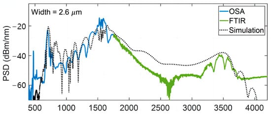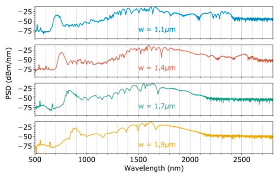 Experimental SC PSD from four different waveguide widths at 80 fs pulse duration and 0.9 nJ/pulse. Reprinted with permission from [42].