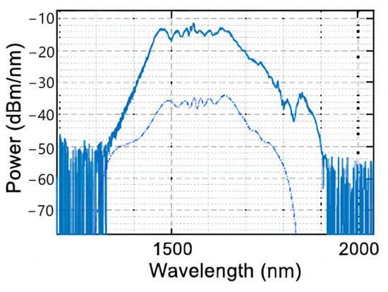 Neetesh [33] et al. deposited a tellurium dioxide (TeO2) layer with a thickness of 370 nm using radio-frequency reactive sputtering on a SiN waveguide with a thickness of 200 nm (T), a width of 1200 nm (W), and a length of 7 mm. The waveguide loss was approximately 0.5 dB/cm [34]. For SC generation, an optical parametric oscillator generating pulses at 1550 nm with a pulse width of 200 fs and a repetition frequency of 80 MHz was used as a pump source. The estimated peak power coupled into the waveguide was 600 W. The output was collected through a multimode fluoride fiber connected to a spectral analyzer. The supercontinuum (SC) spectrum from 1300 nm to 1900 nm generated by the optical parametric oscillator is depicted in Figure 7.