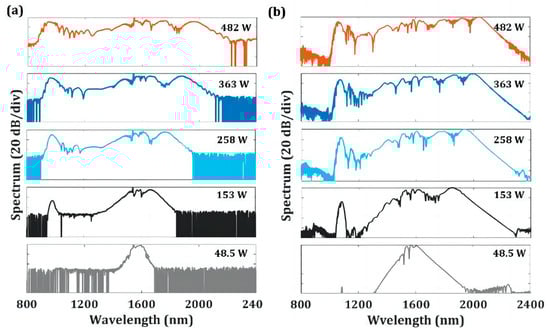 (a) The experimental and (b) simulated SC spectra at different pump powers. Reprinted with permission from [35].