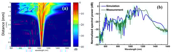 The evolution of SC spectral intensity as a function of propagation distance (a), and the comparison of the simulated and measured spectra (b). Reprinted with permission from [36].