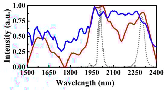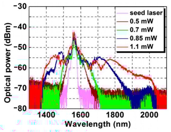 LNO waveguides were also pumped by the laser with a wavelength of ~2.0 μm. In 5 mm length nanophotonic periodically poled lithium niobate waveguides, Marc et al. [74] achieved an SC spectrum from 400 to 2400 nm. C. R. Phillips [75] demonstrated an SC spectrum from 1350 to 2800 nm in the waveguide pumped by a 1930 nm laser with a pulse duration of 97 fs and a repetition rate of 72 MHz.