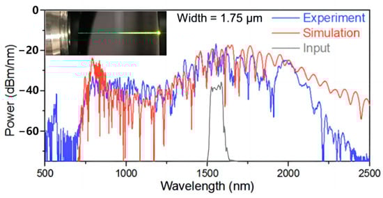 Experimental and simulated SC spectra; the inset is an image of the waveguide where the green and yellow colors are from the third-order dispersive waves of the pump laser. Reprinted with permission from [71].